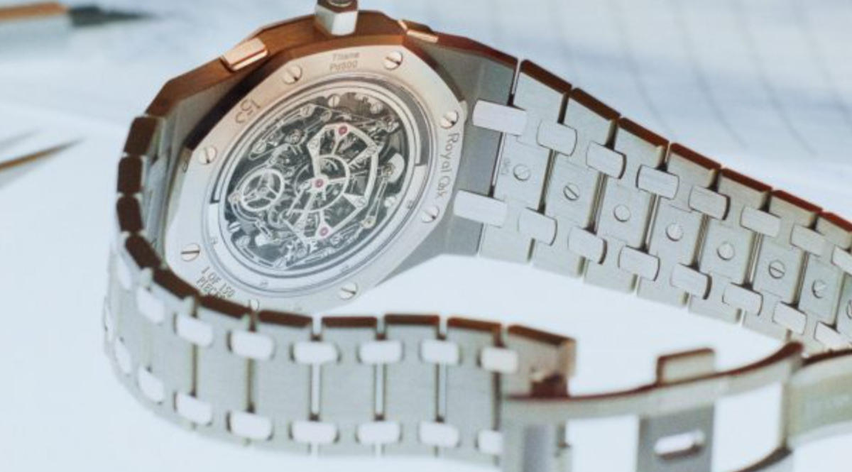 The case and integrated bracelet combine titanium with Bulk Metallic Glass (BMG), an alloy rapidly cooled to attain ultra toughness, devoid of brittle crystalline structures. The bezel blends palladium with BMG, giving it both resilience and a subtle, precious sheen. Remarkably, despite housing a reinvented chronograph and a flying tourbillon, the case measures just 8.1 millimeters thick—a feat that preserves the Royal Oak Jumbo’s extra-thin legacy.